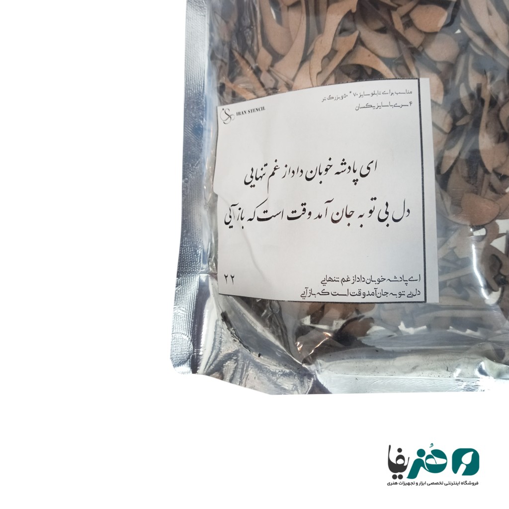 حروف کالیگرافی چوبی دانکار طرح ای پادشه خوبان داد از غم تنهایی دل بی تو به جان آمد وقت است که باز آیی شامل ۴ سری شعر با سایز یکسان ظریف و چشمنواز که جلوهای خاص به دکور شما می بخشد. این قطعات ام دی اف با کیفیت و قابلیت رنگپذیری با رنگهای آکریلیک را دارند تا بتوانید مطابق سلیقه خود آنها را شخصیسازی کنید. برای نصب کافیست از چسب چوب استفاده کنید و روی سطوح مختلف مانند بوم نقاشی، بیسهای چوبی، دیوار و دیگر فضاهای دلخواه اجرا نمایید.